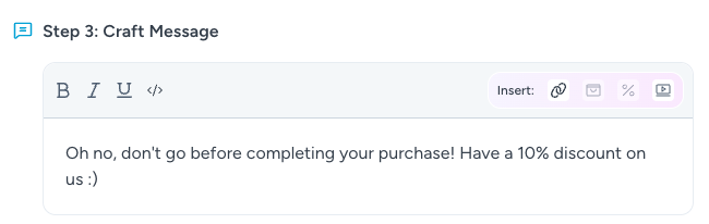 The campaign message supports rich HTML content. Write the message the customer will see in the chat bubble. You can format your message using the rich-text controls or choose to edit the raw html directly.