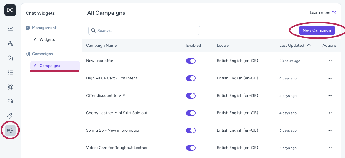 Log in to the DigitalGenius Dashboard and navigate to Campaigns by clicking on the Chat Widget item in the sidebar, navigating to All Campaigns and clicking on the New Campaign button.