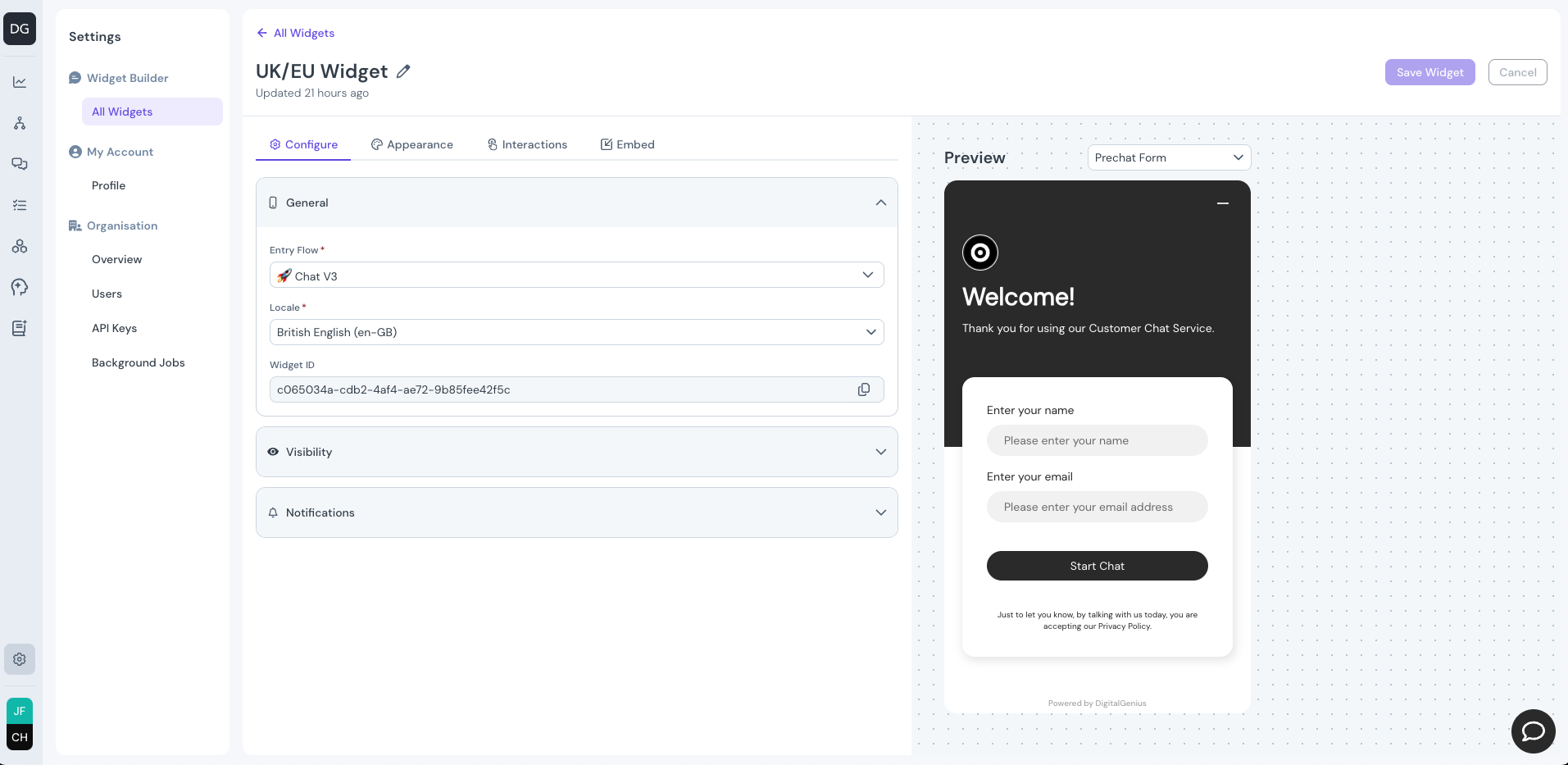 DigitalGenius Chat offers a powerful Widget Builder within our dashboard, enabling users to effortlessly create and customize chat widgets.