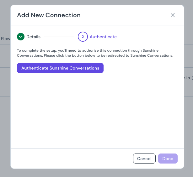 Once submitted click on the Authenticate Sunshine Conversations button and follow the steps to authorize DigitalGenius with Sunshine Conversations: