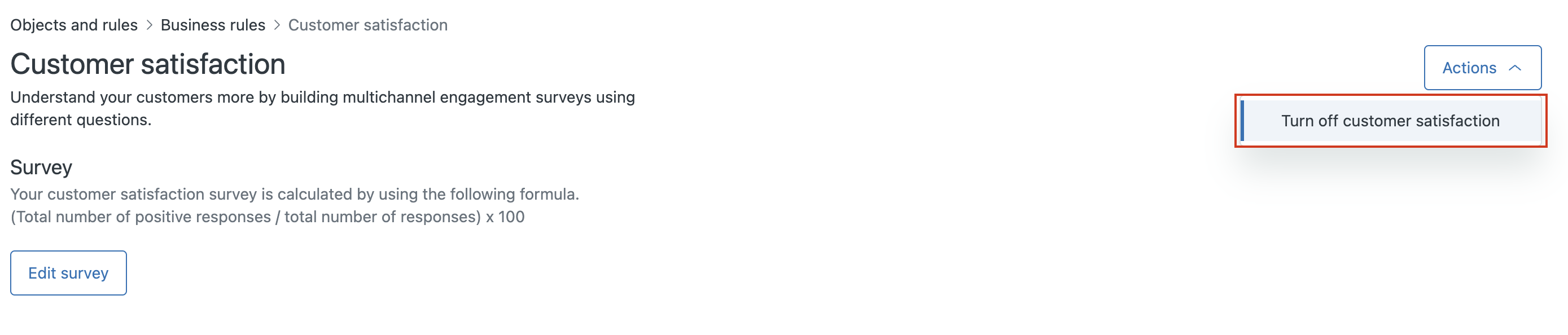 In the top right, click the Actions button and select Turn off customer satisfaction.