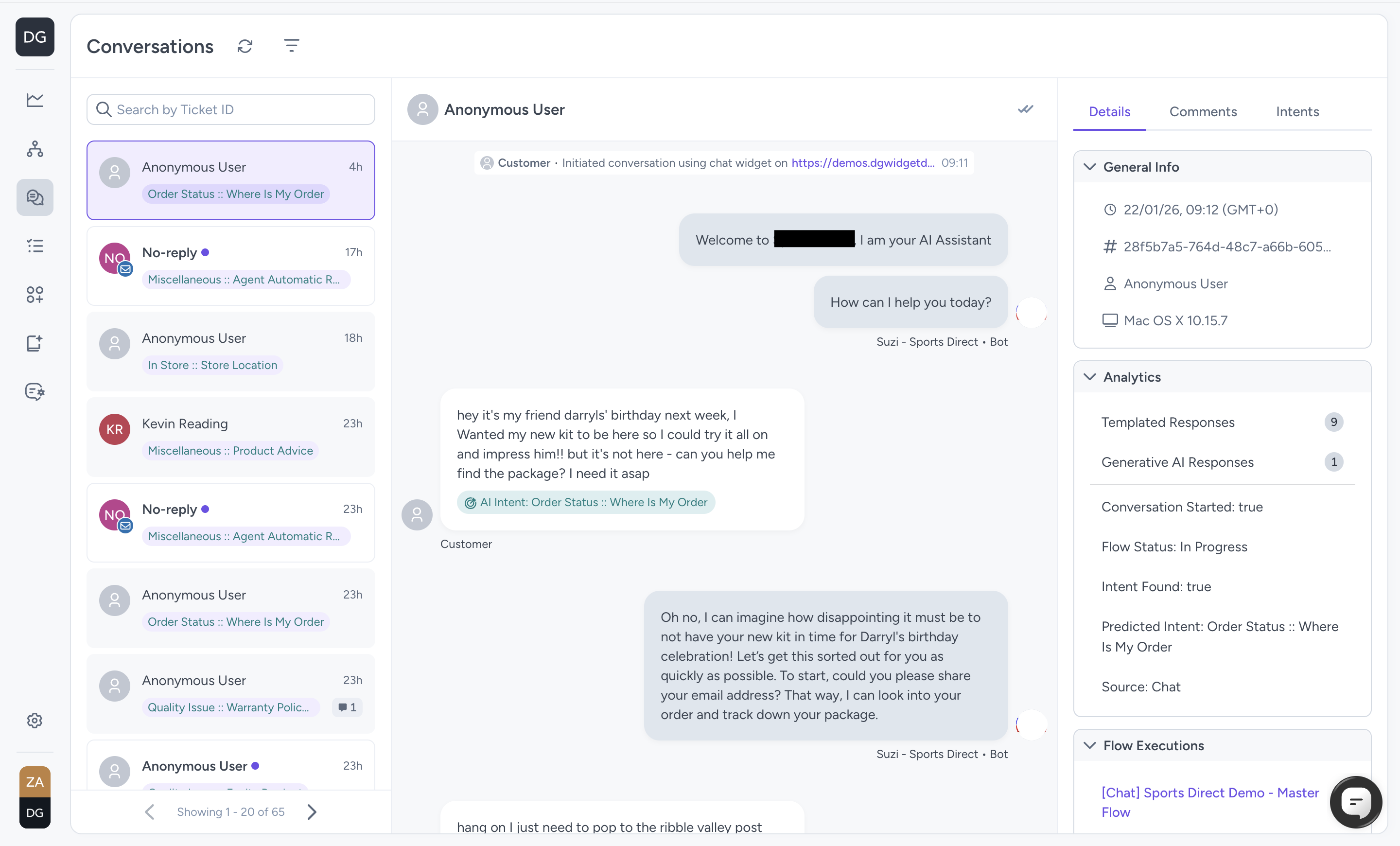 - Review the message timeline and any automation, intent detection, or knowledge base articles used.
