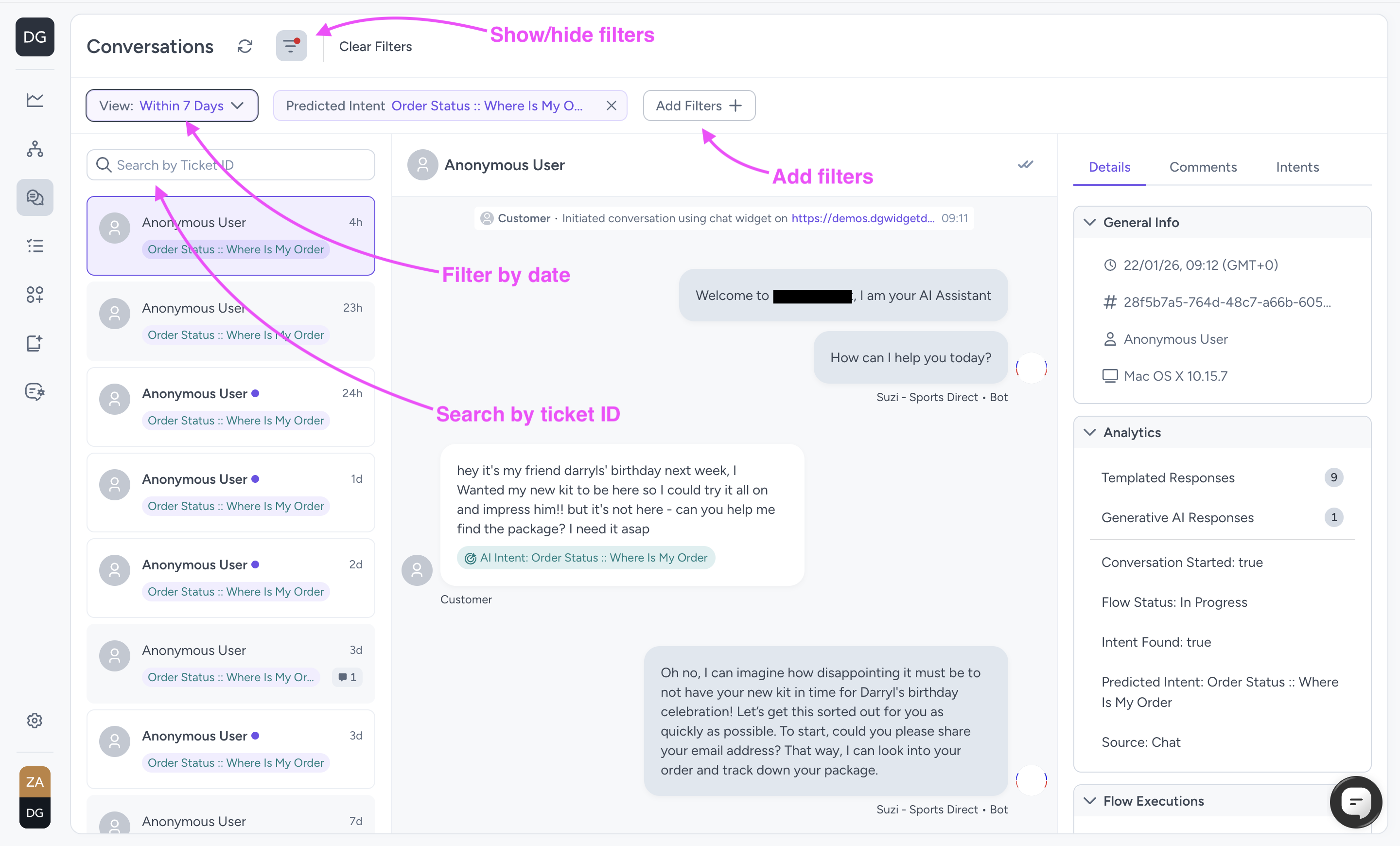 - Use Search by Ticket ID or Show filters to find the conversation(s) you need.
